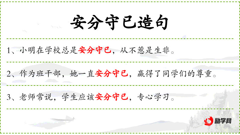 - 安分守已:形容词,指遵守规则,不越轨,不惹事。