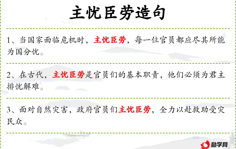 - 主忧臣劳:指君主有忧虑时,臣子应该努力工作以解决问题。