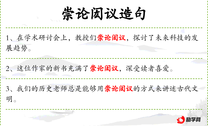 - 崇论闳议:指高深的理论和宏大的议论,常用于形容学术或文学作品中的深刻见解。