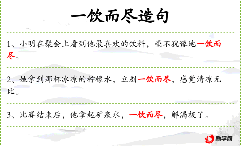 1. 【一饮而尽】 - 饮:喝。一口气就喝完了。形容喝得非常爽快。