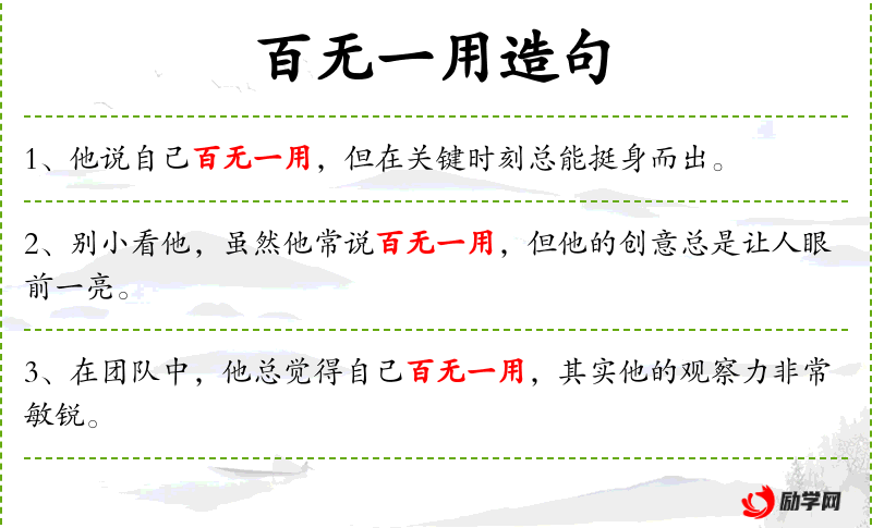 4. 【百无一用】 - 百样之中无一有用的。形容毫无用处。