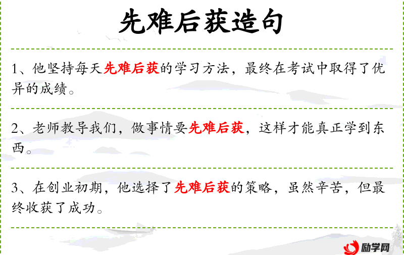“先难后获”是传统文化中的一个重要观念,强调在面对困难时要有耐心和毅力,通过克服困难来获得最终的成功。这种观念在的教育和家庭教育中被广泛提倡。