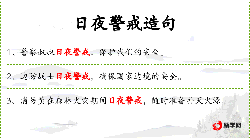 1. 【日夜警戒】 白天黑夜不断警戒或监视。