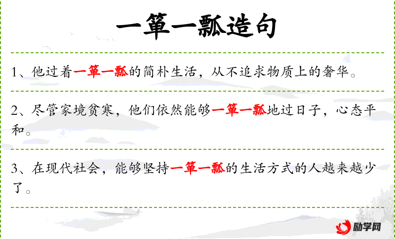 1. 【一箪一瓢】 一箪食物,一瓢饮料。形容读书人安于贫穷的清高生活。