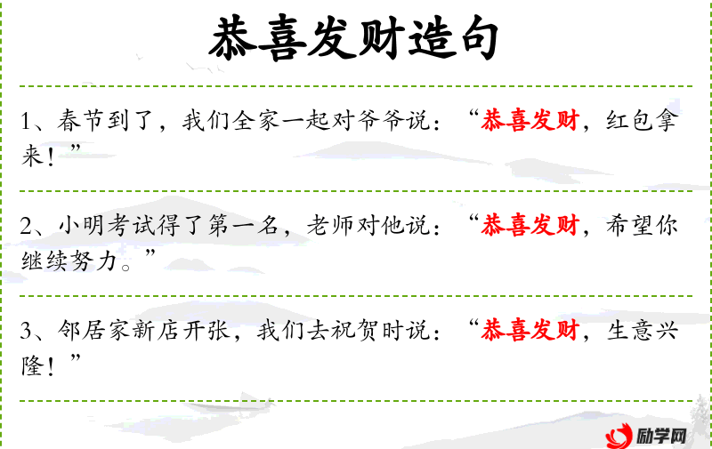 - 恭喜发财:一种祝福语,希望对方财富增加。