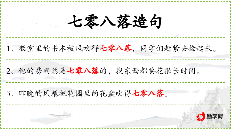 1. 【七零八落】 - 形容零散稀疏的样子。特指原来又多又整齐的东西现在零散了。