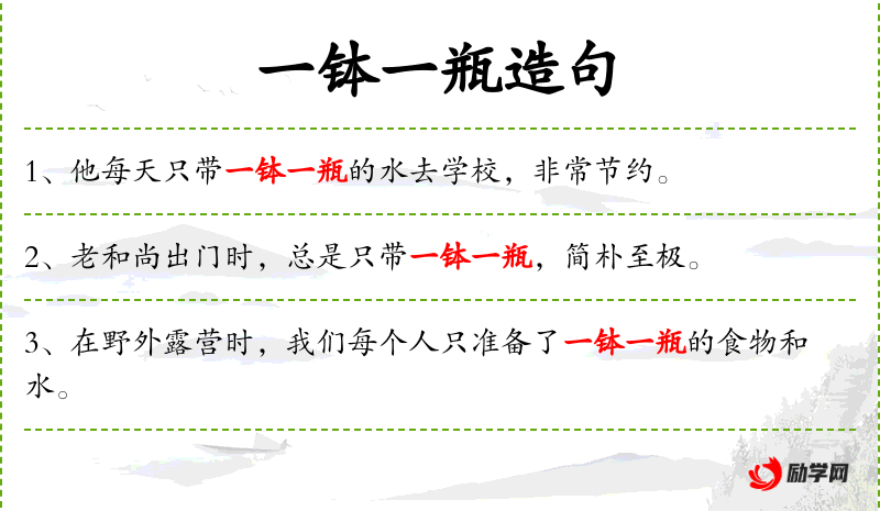 1. 【一钵一瓶】 - 钵、瓶:和尚的饮食器具。指和尚云游时的简单食具。形容家境贫寒
