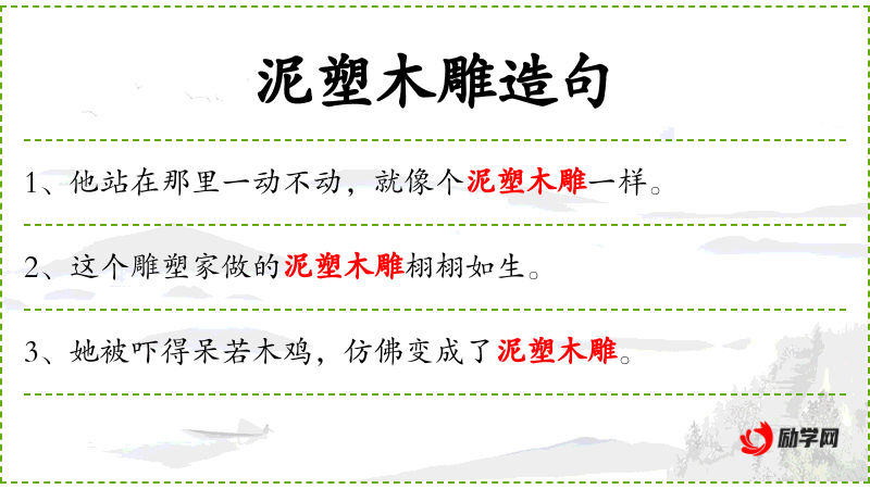 3. 【泥塑木雕】 - 指泥做的和木头雕的偶像。比喻人的表情和举动呆板。
