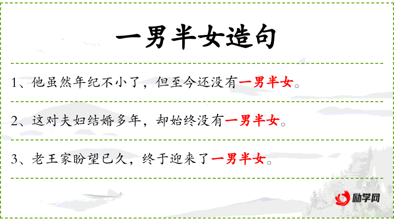 - 一男半女:名词短语,通常指一个男孩和一个女孩,或者一个男孩和一个未成年的女孩。
