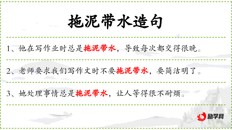 - 拖泥带水:形容说话或做事不干脆,拖拉,效率低。