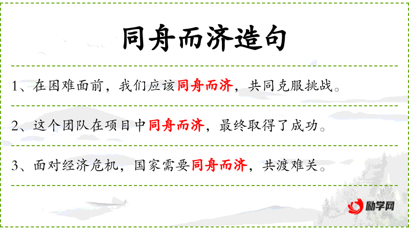 - 同舟而济:这个成语源自《孙子兵法》,强调在困难时期团结一致的重要性。