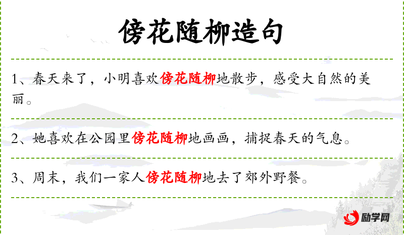 “傍花随柳”在*文化中常用来形容春天的美景和人们赏春的俗。这个短语蕴含了人们对自然美的欣赏和对春天的喜爱。