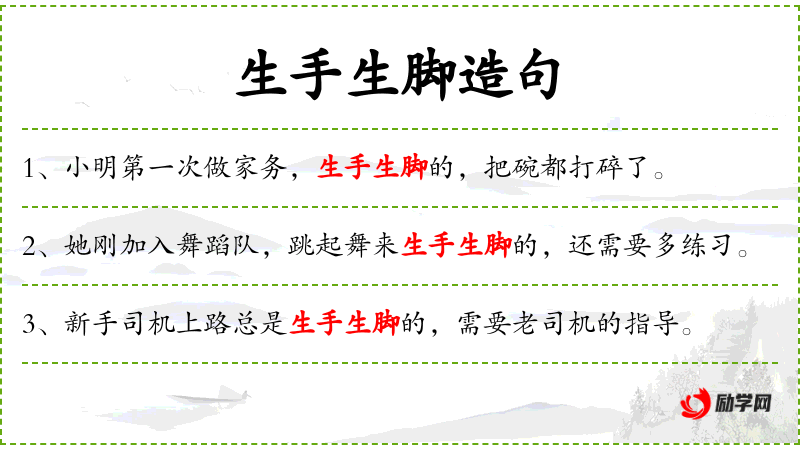 5. 【生手生脚】 - 形容对所做的某项新工作不熟悉的样子。