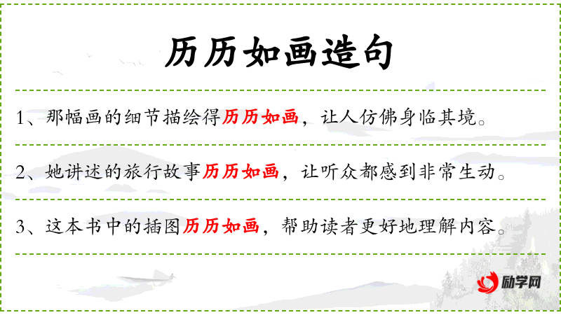 - 历历如画:形容事物非常清晰、生动,如同画出来的一样。