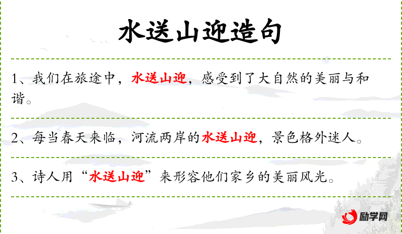 3. 【水送山迎】 - 玩赏风景,寄情山水。也指旅途绵长。