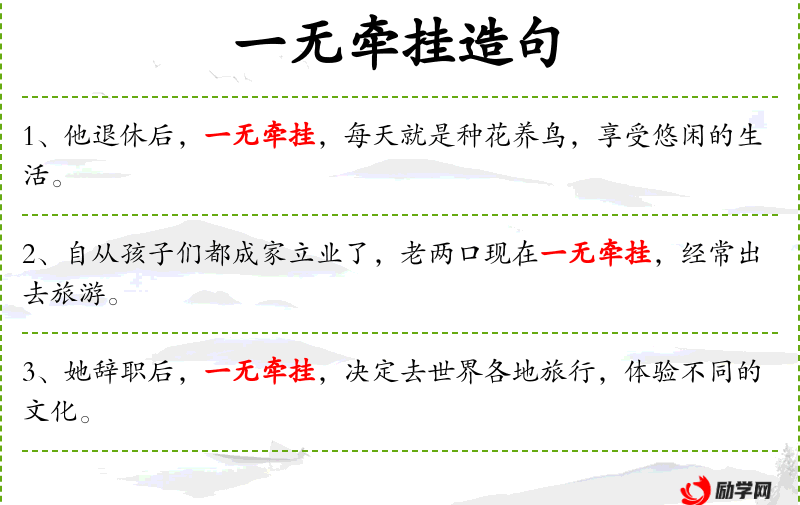 2. 【一无牵挂】 指没有任何挂念的人和事。