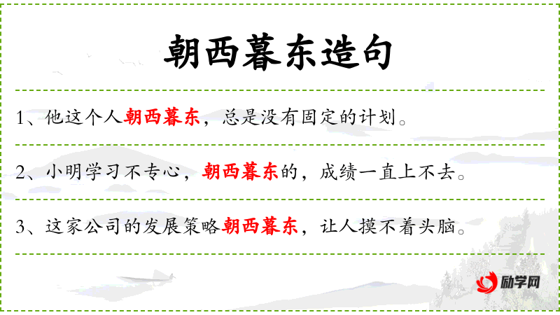 1. 【朝西暮东】 - 朝:早晨。早晨在西,晚上在东。指行踪不定。比喻变来变去,不专一。