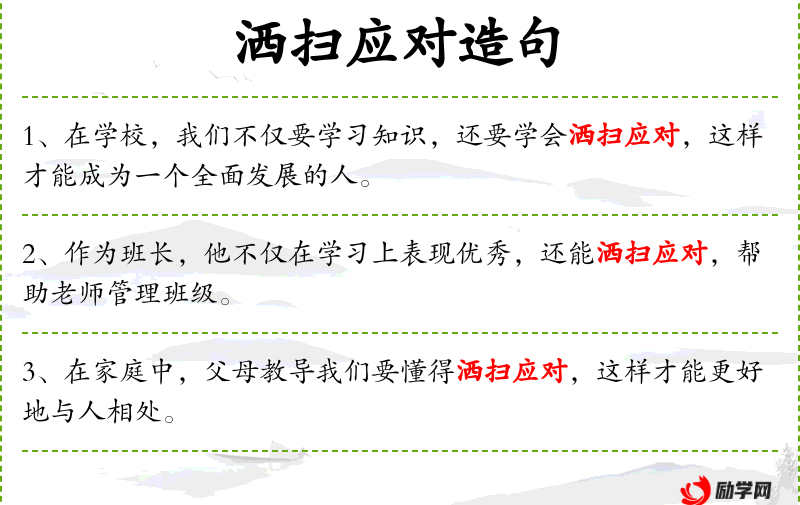 3. 【洒扫应对】 - 洒水扫地,酬答宾客。封建时代儒家教育、学习的基本内容之一。