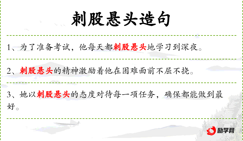 - 刺股悬头:这是一个成语,源自*古代的刻苦学的故事,形容学*或工作非常刻苦,不顾身体。