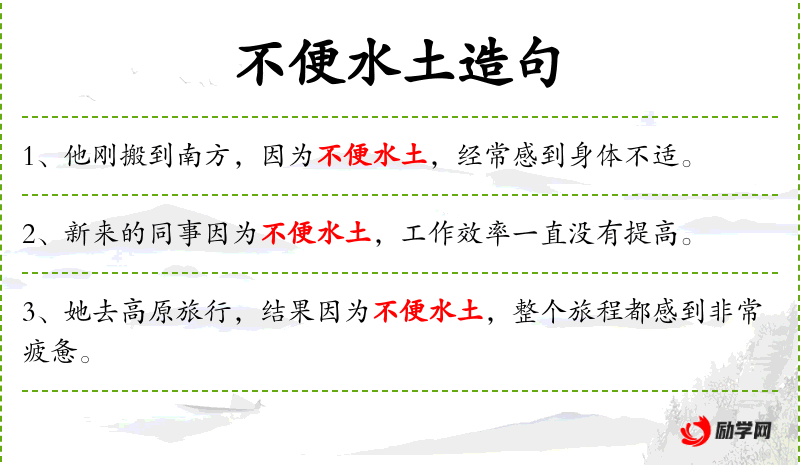 - 不便水土:成语,指不适应新环境。