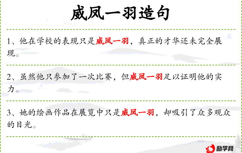 “威凤一羽”是一个成语,源自**古代文化,用来形容事物虽小却有重大影响。这个成语体现了中华文化中对细微之处的重视和赞赏。
