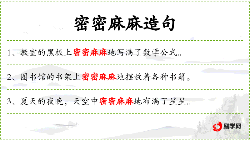 - 状语:考试前、密密麻麻地