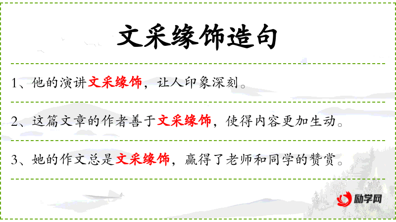 - 文采缘饰:指文章的文采和修饰,通常用来形容文章写得好,有文采。
