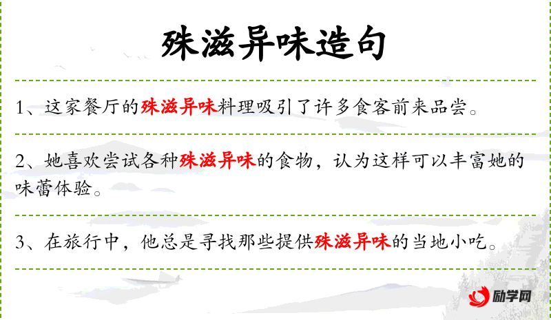 2. 【殊滋异味】 - 奇异的滋味。指美味佳肴。