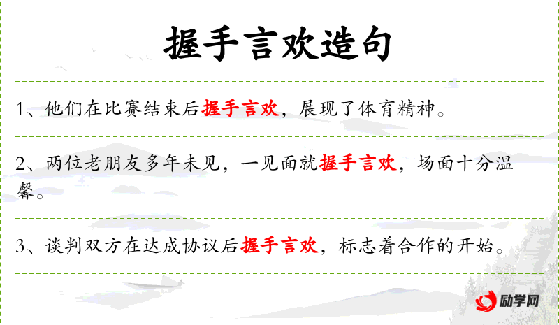- 握手言欢:动词短语,表示友好地握手并交谈。