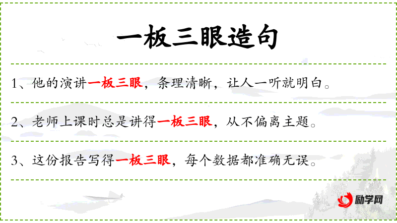 1. 【一板三眼】 - 板、眼:戏曲音乐的节拍。比喻言语、行动有条理或合规矩。有时也比喻做事死板,不懂得灵活掌握。