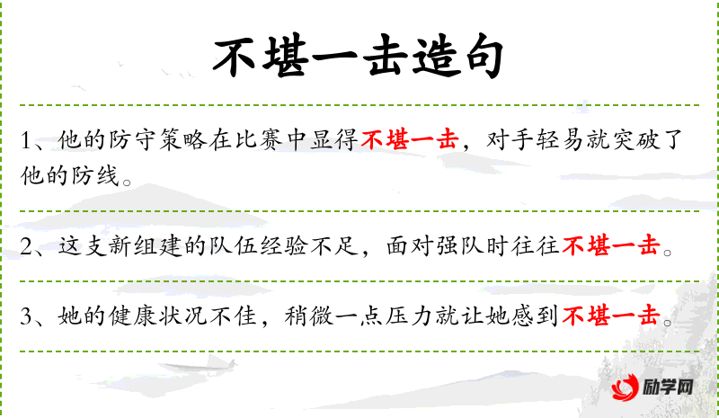 1. 【不堪一击】 不堪:经不起。形容力量薄弱,经不起一击。也形容论点不严密,经不起反驳。