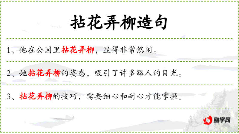 - 拈花弄柳:这个成语源自**古代文学,常用来形容男子的风流或不正经的行为。