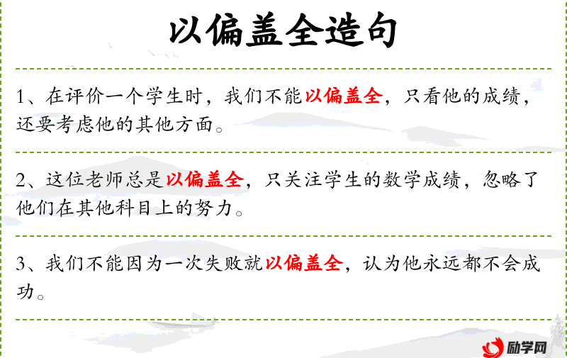 句子:“在做市场分析时,以偏盖全的方法是不可取的,我们需要全面考虑各种因素。”