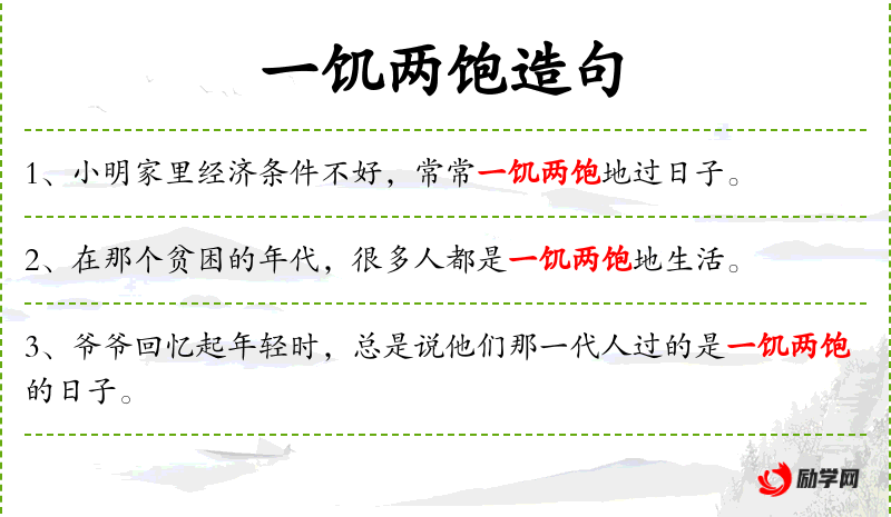 1. 【一饥两饱】 - 犹言每天不能饱食。形容生活贫困。