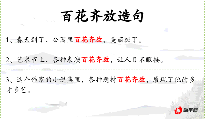 形容百花盛开,丰富多彩。比喻各种不同形式和风格的艺术自由发展。也形容艺术界的繁荣景象。
