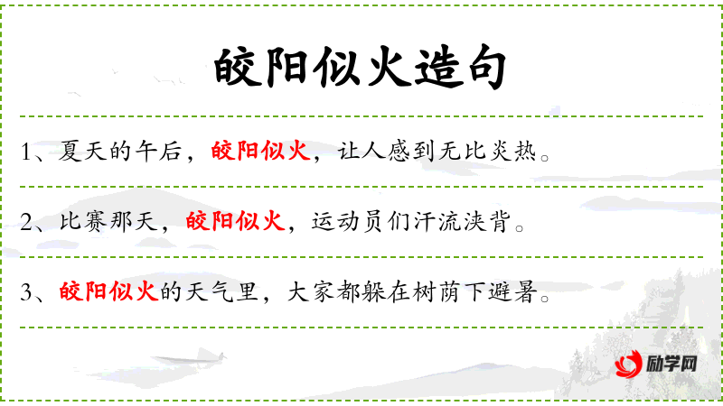 2. 【皎阳似火】 - 皎:白而亮。太阳像火一样燃烧。多形容夏日的炎热。