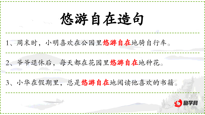 - 悠游自在:形容词短语,表示轻松自在、无拘无束的状态。