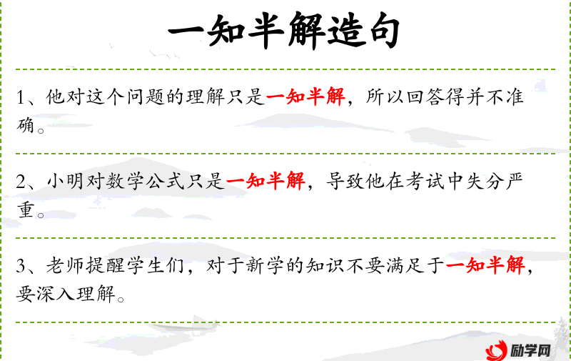 1. 【一知半解】 知道得不全面,理解得也不透彻。