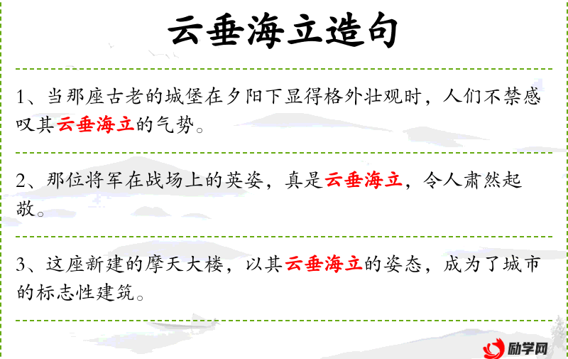 “云垂海立”是一个汉语成语,源自古代文学作品,形容景象宏伟壮观。在现代汉语中,常用来形容气势磅礴、震撼人心的事物。了解这一成语的文化背景,有助于更深刻地理解句子的含义。