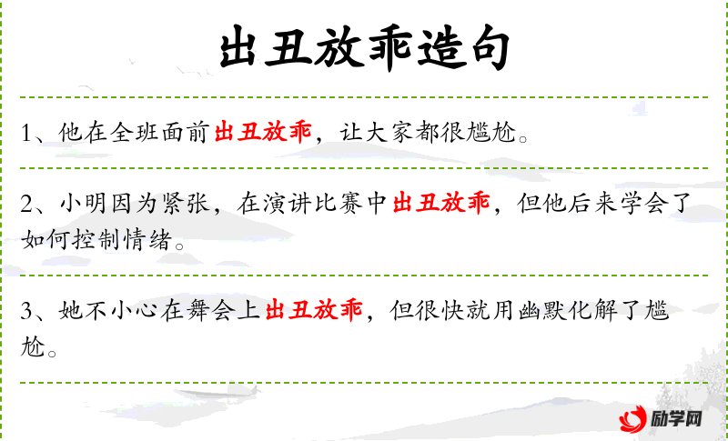 - 出丑:动词短语,意思是做出让人尴尬或丢脸的行为。