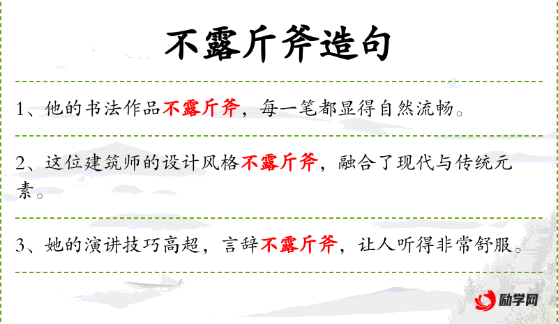 1. 【不露斤斧】 - 斤:斧头。看不见刀斧加工的痕迹。形容精巧自然。