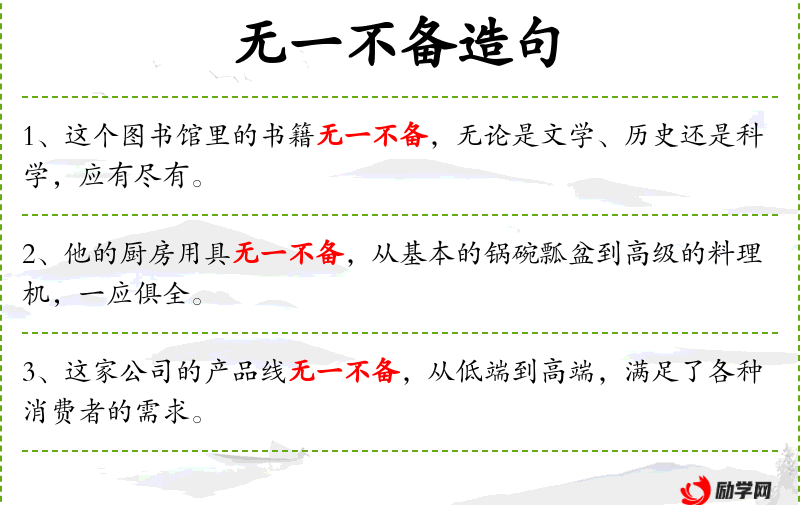 - 无一不备:表示所有的东西都准备齐全。