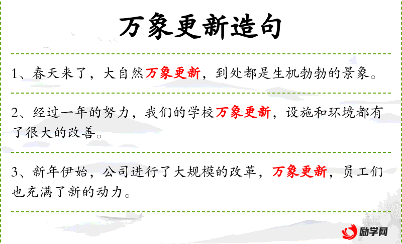万象:宇宙间一切景象;更:变更。事物或景象改换了样子,出现了一番新气象。