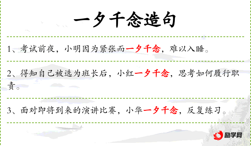 - 一夕千念:成语,形容一夜之间思绪万千。