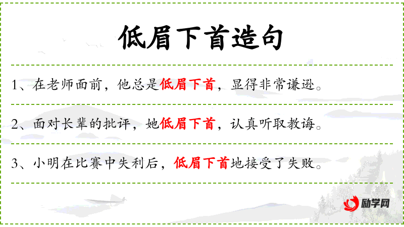 1. 【低眉下首】 低:低下;下:低;首:头。低着眉垂下头。形容顺良,顺从。