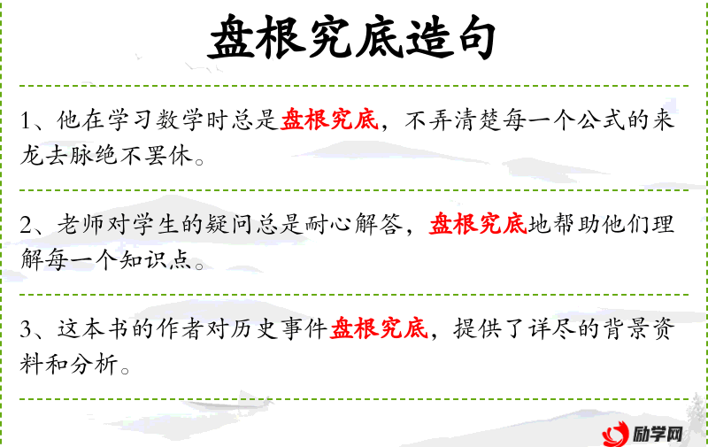 6. 【盘根究底】 盘:仔细查问;究:追究。盘问、追究事情的根由。