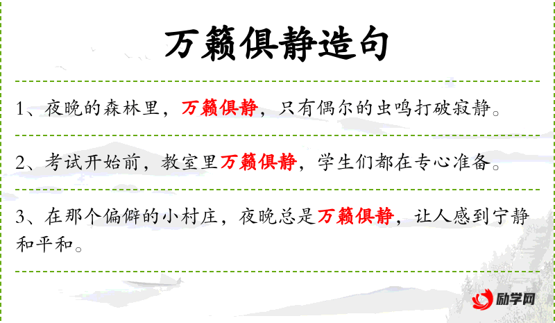 - 万籁俱静:形容环境非常安静,没有任何声音。