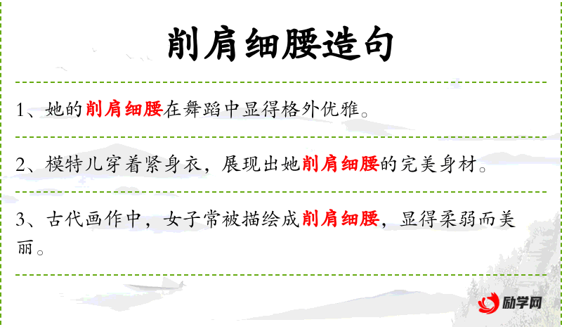 - 削肩细腰:形容肩膀窄小,腰部纤细。