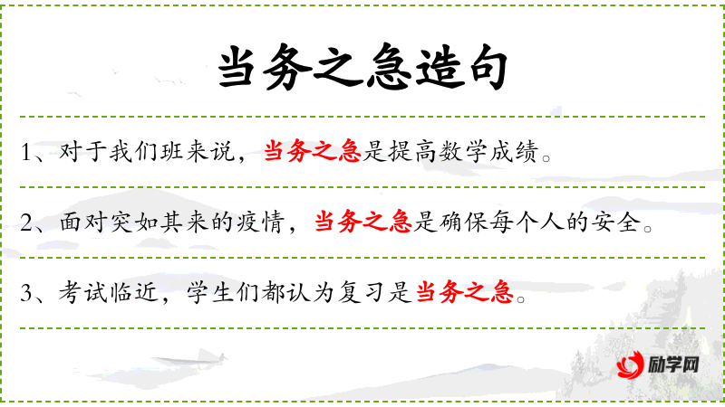 句子:“对于我们班来说,当务之急是提高数学成绩。”