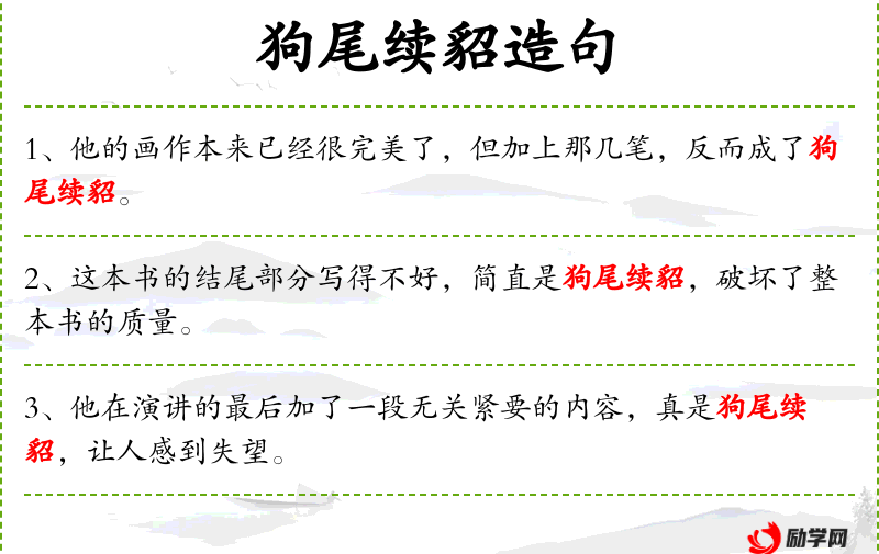 1. 【狗尾续貂】 续:连接。晋代皇帝的侍从官员用作帽子的装饰。指封官太滥。亦比喻拿不好的东西补接在好的东西后面,前后两部分非常不相称。
